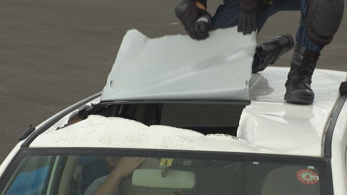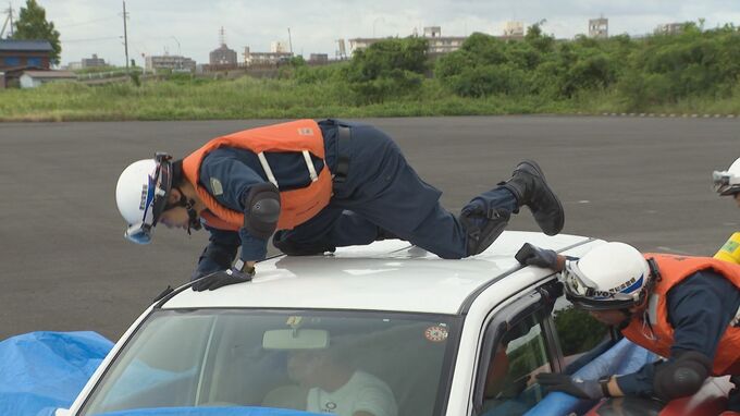 この訓練は、大雨で冠水したアンダーパスを想定して、窓付近まで水に浸かった車から逃げ遅れた人を救助するというものです。