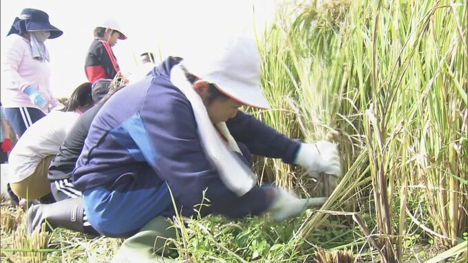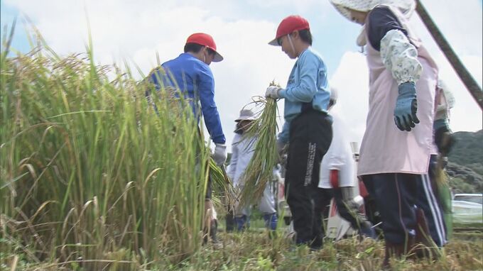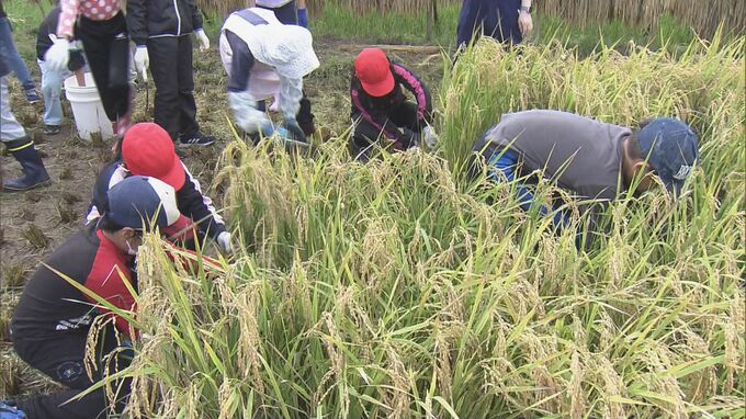 14日は4年生と5年生、約40人が昔ながらの方法で稲刈りを行い、一束一束鎌を使って丁寧に刈り取っていきました。