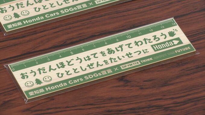 15日は、ホンダカーズ三河の加藤博巳社長らが大村秀章知事を訪ね、愛知県内の小学1年生全員に配るため、県内産の木で作られた、交通安全の標語が入った定規6万4000本あまり、金額にして約890万円相当を寄付しました。