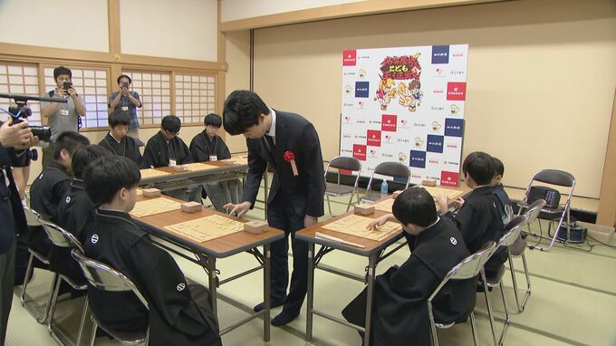 真剣な表情で対局に挑む子どもたち。藤井七冠は一度に9人を相手に、時折考え込む様子を見せながら将棋を指し、対局の後は子どもたちにアドバイスをしていました。