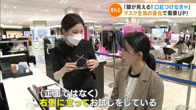 この店ではマスクを外しての口紅のお試しも再開していました。