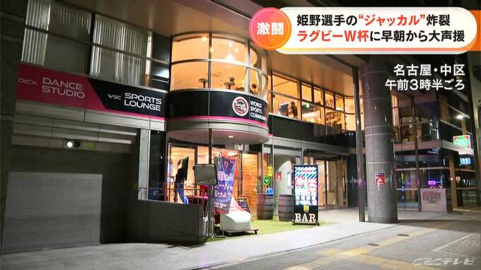 「午前4時前の名古屋市中区のスポーツバーです。ラグビー日本代表を応援しようと人々が集まっています」