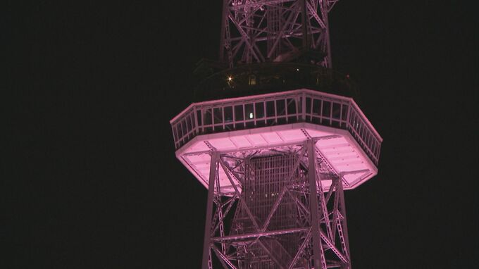名古屋市でも乳がんの検診や早期治療の大切さを啓発しようと、中部電力ミライタワーなどがライトアップされました。