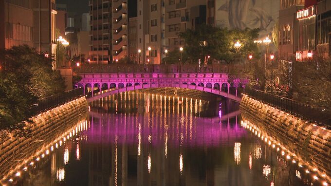 ピンク色は乳がん検診啓発のシンボルカラーで、ことしから名古屋市を流れる堀川にかかる納屋橋と錦橋もピンク色に染まりました。
