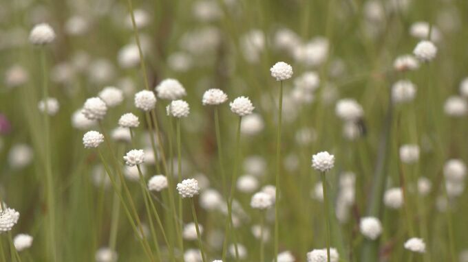 今は、秋の使者といわれる「シラタマホシクサ」が群生し、その中に赤紫色の「ミカワシオガマ」が鮮やかに咲き誇る様子を楽しむことができます。