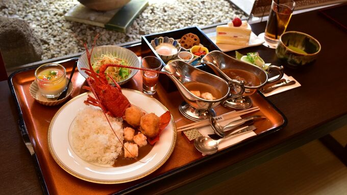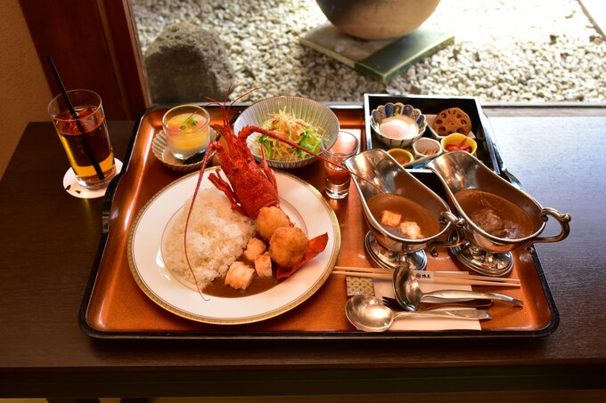 昭和初期から300局以上のタイトル戦が行われてきたこの名旅館で、多くの棋士たちにこよなく愛されてきた“名物カレー”です。大きな伊勢エビまるごとにビーフと、ボリューム満点ですが…