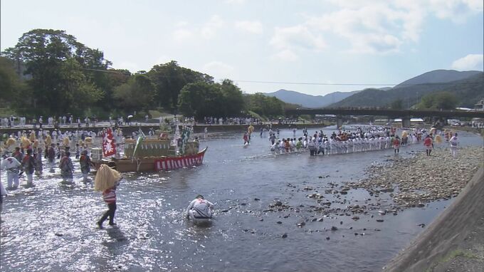 「川曳」は、ことし収穫した稲穂「初穂(はつほ)」を載せた初穂舟(はつほぶね)を曳いて五十鈴川(いすずがわ)をさかのぼり、内宮へ奉納するものです。