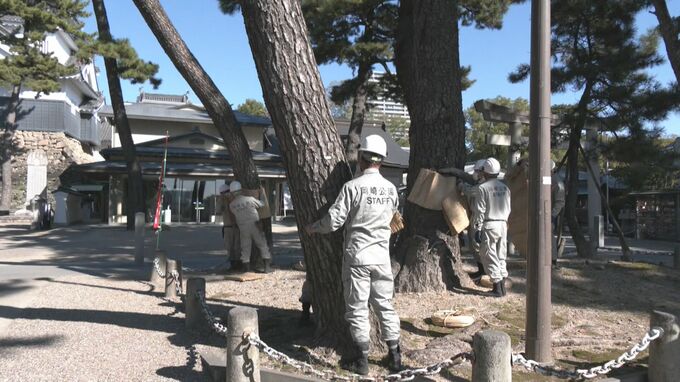 24日午前9時半から、岡崎城周辺の松や、幹の周りが4メートルある推定樹齢400年の大黒松(おおくろまつ)に作業員らが次々と「こも」を巻き付けていきました。