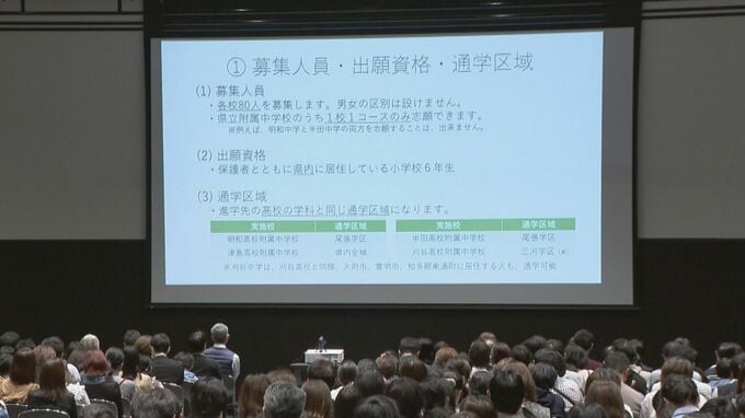 定員1500人に2500人の申し込み 2025年度開校の県立の中高一貫校“明和高校附属中学校”の説明会 2023年10月29日(日) 19:42 国内 2025年度に愛知県で開校する県立の中高一貫校について、10月29日、児童や保護者を対象とした説明会が行われました。愛知県は2025年の4月に、初の県立中高一貫校として、明和(めいわ)、半田(はんだ)、刈谷(か…