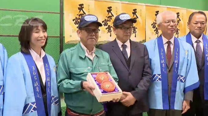 岐阜県産の高級ブランド柿「天下富舞(てんかふぶ)」の初競りが行われ、2個100万円で競り落とされました。