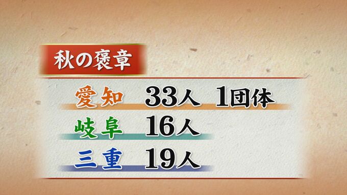 東海3県で「秋の褒章」の受章者に選ばれたのは、愛知で33人と1つの団体、岐阜で16人、三重で19人です。
