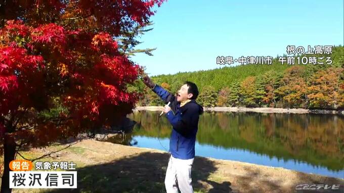 常緑樹の中に鮮やかな赤や黄色の葉をつけた木々。標高およそ900メートル。岐阜県の恵那市と中津川市にまたがる根の上(ねのうえ)高原では、紅葉が見ごろを迎えています。