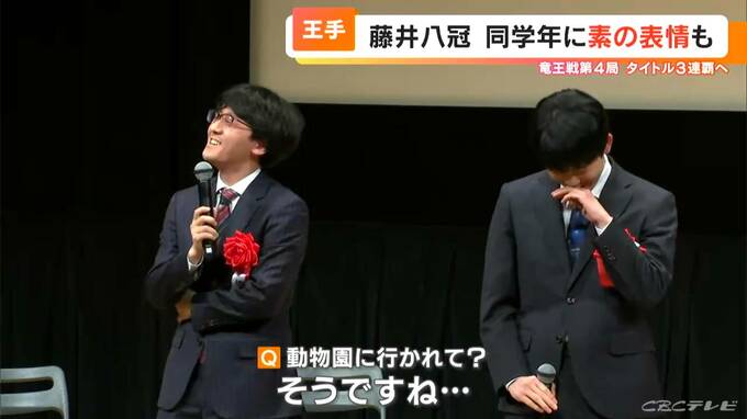 インタビューの受け答えにとまどう伊藤七段に思わず笑顔。同級生に見せるような“素”の藤井八冠が垣間見えました。