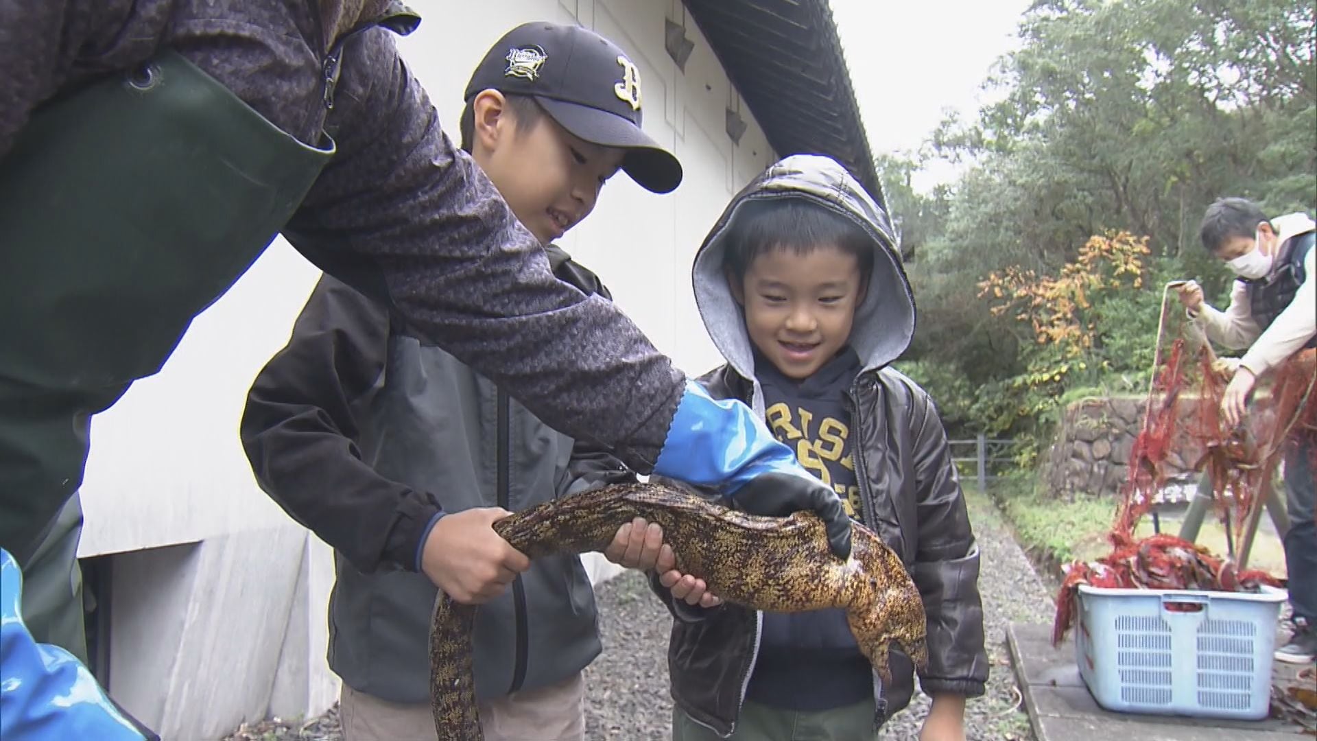 網には、お目当てだった伊勢エビのほかにもアイゴやメジナ、ウツボなどもかかり、子どもたちは普段見られない生き物を触ったり観察したりして大喜びした様子でした。