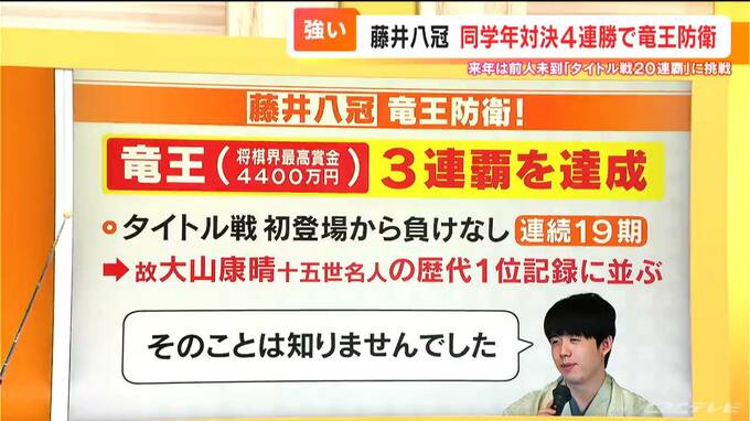 藤井八冠は、タイトル戦初登場から負けなしで、ここまで“連続19期”達成なんですね。この連続記録というのは、大山康晴十五世名人の歴代1位記録に並んでいるということで、ただ藤井八冠ご本人は「そのことは知りませんでした」ということだったんです。