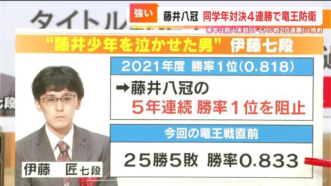 2021年度の勝率は1位でした。その勝率は、8割1分8厘なんですね。プロの世界で6割を超えたら強い。7割を超えたらかなり強い。8割超えたらとてもとても強いというふうに言われているわけですよ。藤井八冠のこれまでの5年連続勝率1位を阻止したのが、伊藤七段なんですよね。