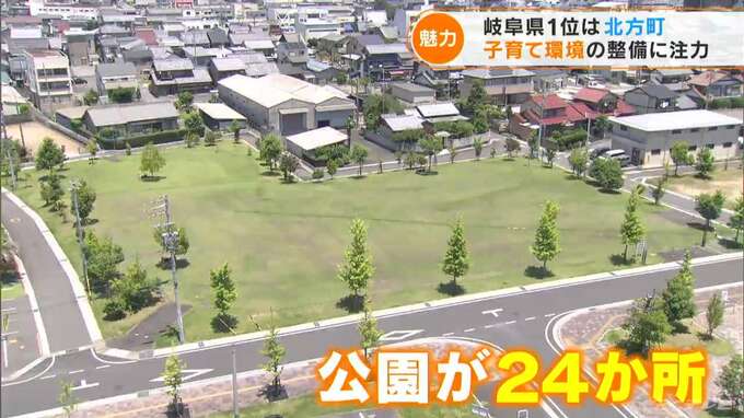 北方町では、若い世代の人口を増やすため子育て環境の整備に力を入れていて、町内には公園が24か所あり、子どもの遊び場も充実。