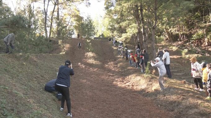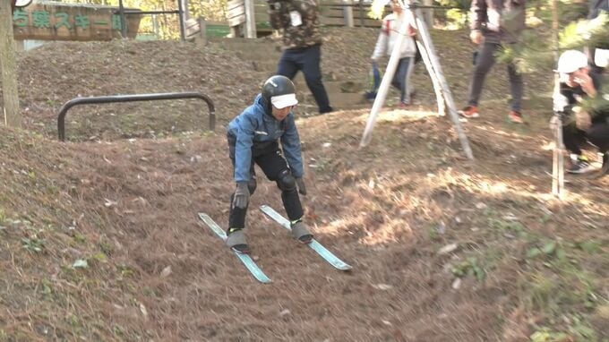 落ち葉を敷き詰めたゲレンデを滑る「落ち葉スキー」が、愛知県岡崎市の小学校で始まりました。