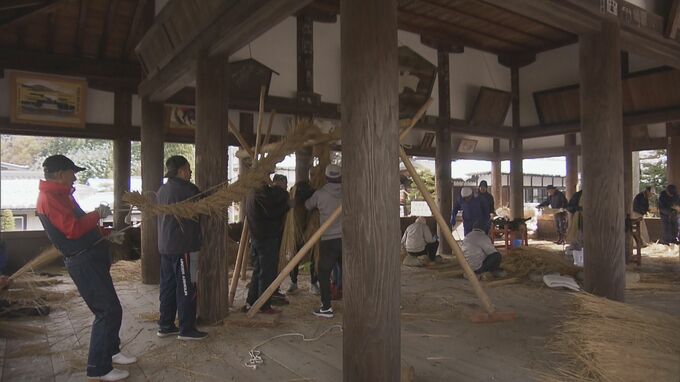 神門を飾る大しめ縄は長さ7メートル余り、太さ20センチ程もあり、作業は数人がかりで1時間ほどかかりました。