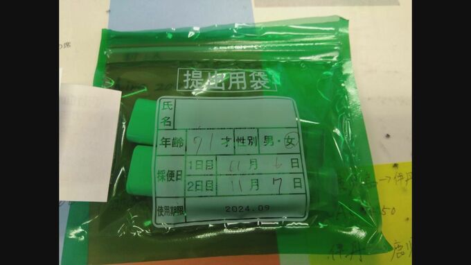 検便キットの緑色のパッケージには、採便日が「11月6日」と「11月7日」との記載、そして鹿児島県内に住む71歳の女性の名前が書かれていました。