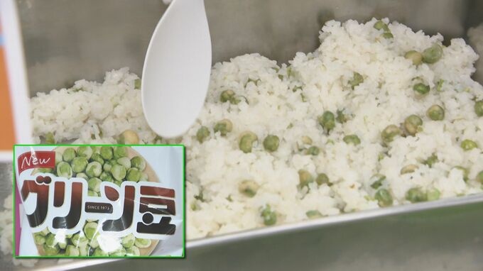 ロングセラー商品の「グリーン豆」を、ごはんの中に入れ、エビ天の中には「グリーン豆」と「つぶグミPEMIUM」のキウイ味を細かく刻んで入れました。