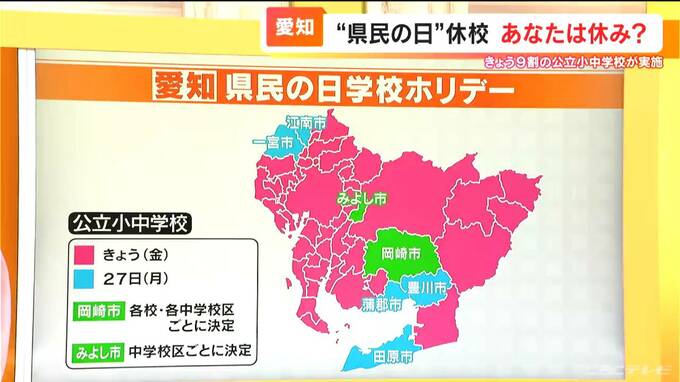 改めまして、この「県民の日学校ホリデー」ですが、24日は学校がお休みの自治体は、名古屋市を初め、ピンクになっているところ、47市町村です。