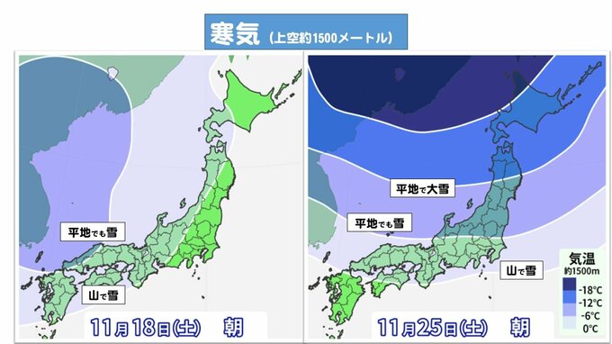 先週18日(土)には寒気の影響で、西日本で初雪ラッシュ(福岡で平年より30日も早い初雪)になりましたが、25日(土)は、西日本よりも北陸から北日本で寒気が強く、平年に比べると10~15℃も低い寒気が入ります。