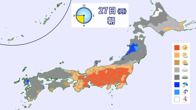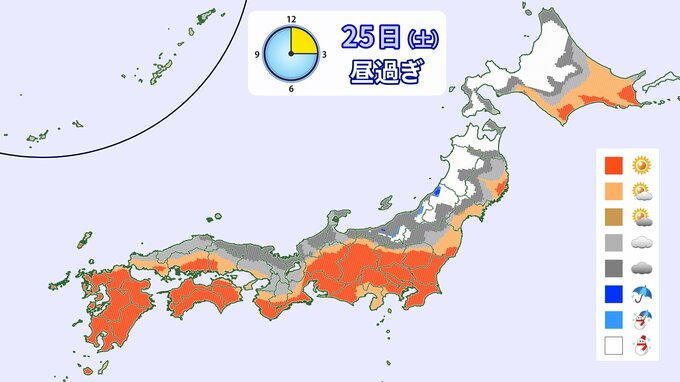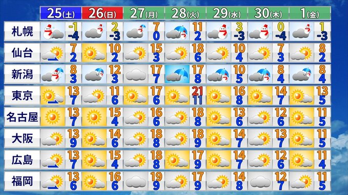 25日(土)の気温は、24日に比べて最高、最低とも10℃ほど低くなる所が出てきます。特に26日(日)の朝までは、広く冷え込みが強まりそうです。