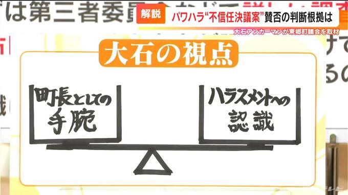 そして、そもそも「辞職は本人が決めるべき」という意見もありました。同じ証拠についても、どう見るのかというのが判断わかれたことになるんですが、大石の視点は、町長の辞職に関して、町長としての手腕とハラスメントの認識。これを両んびんにかけたときにどう判断するかということですね。