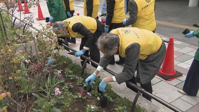 30日は協議会や名古屋西ロータリークラブの会員ら約25人が参加し、長さ60メートル、奥行き2メートルの花壇に約20種類の花の苗や球根をひとつひとつ丁寧に植えていきました。
