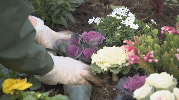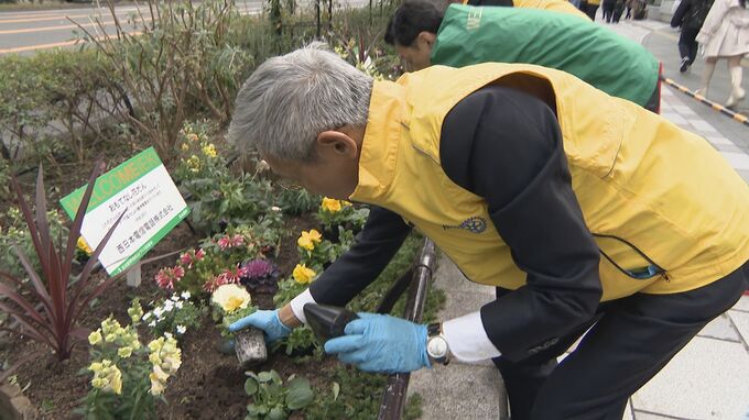 中部の玄関口名古屋駅前の花壇が、「おもてなし」の花で彩られました。