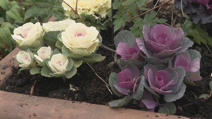色鮮やかなパンジーや葉ボタンが植えられているのは、名古屋駅前の「おもてなし花だん」。