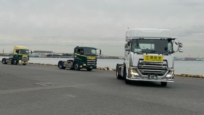 5日はこれをアピールするため、名古屋市港区で白バイやパトカーの先導のもとトラックのパレードが行われ、警察官や地元のトラック運転手ら約50人が参加しました。
