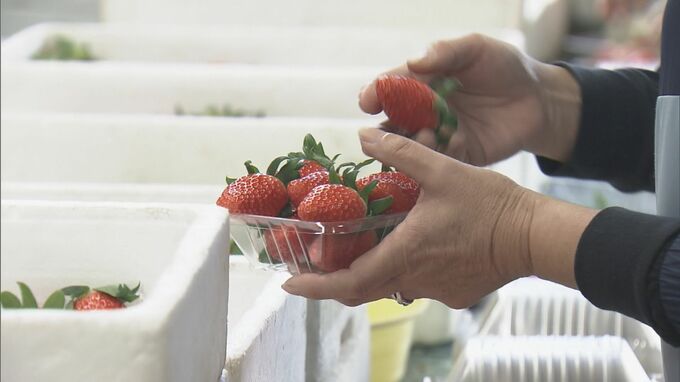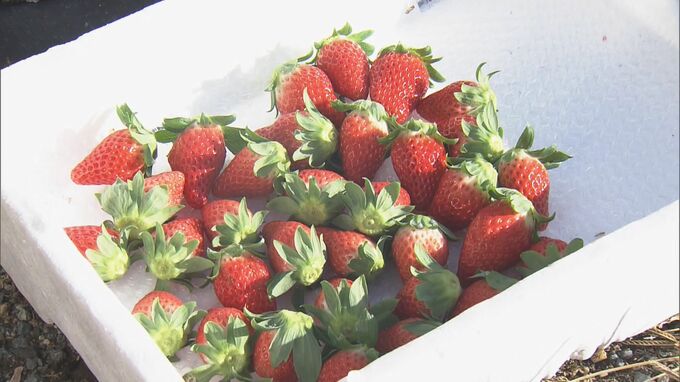 収穫されているのは、すっきりとした甘みが特徴の「章姫(あきひめ)」で、ことしは長く続いた猛暑で生育が心配されましたが、11月から冷え込む日が続いたため出来は例年並みだということです。