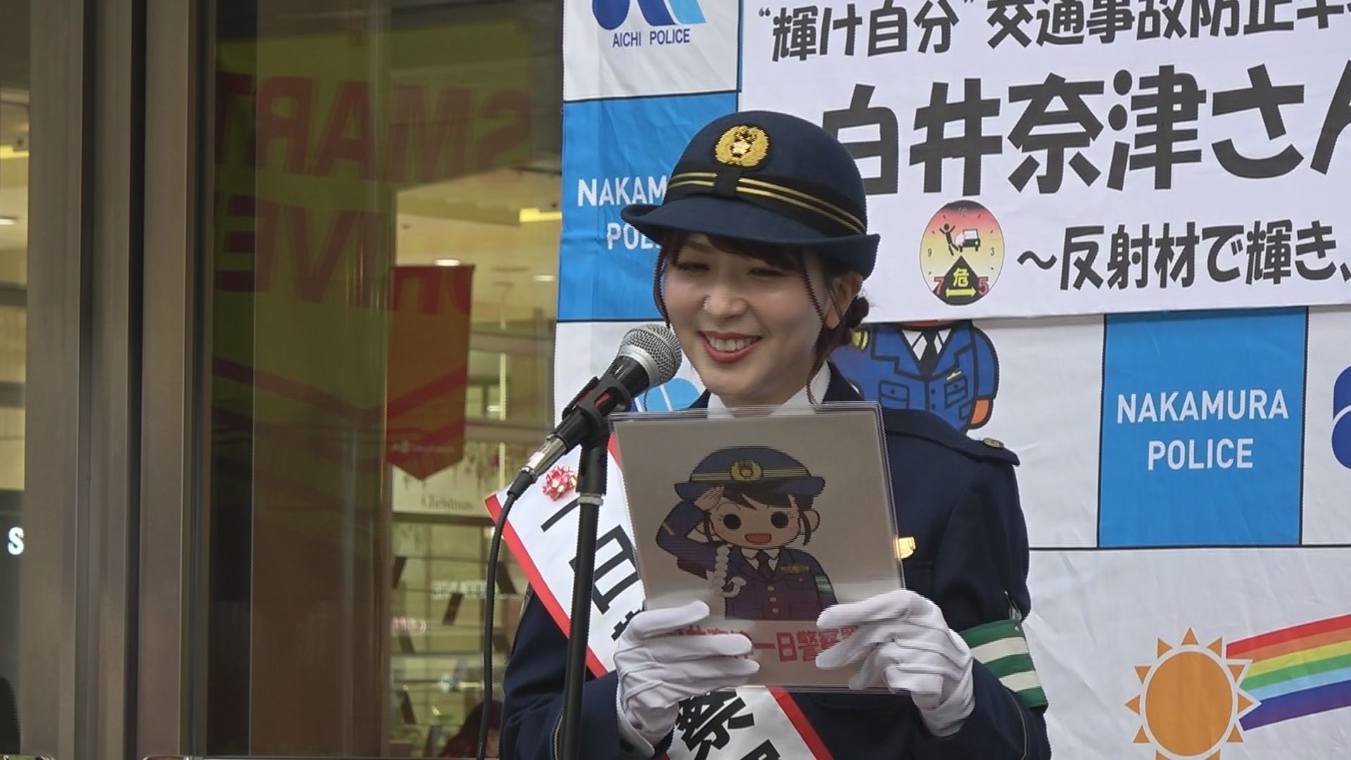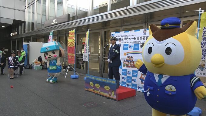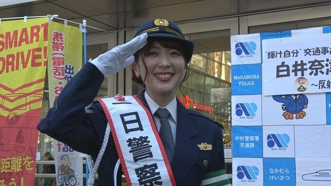 2022年の「愛知県警交通安全大使」も務めた名古屋市出身のタレント・白井奈津さんが中村警察署の一日警察署長に就任し、集まった人に向けて交通安全クイズで事故防止を呼びかけました。
