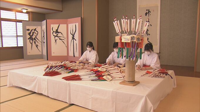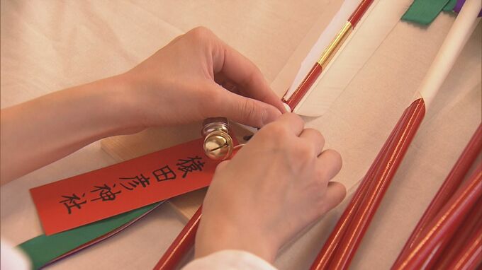 境内では、巫女たちが来年の干支「辰」にちなみ、竜が描かれた絵馬をはじめ、鈴や五色の吹き流しなどを一つ一つ丁寧に矢に結び付けていました。