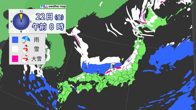 22日(金)の朝までの24時間で、多い所では、北陸地方で70センチの雪が予想されています。また、22日の朝晩は平野部でも雪の降る所があるでしょう。