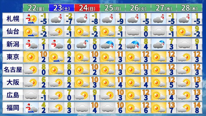 12月21日(木)の最高気温は、東京で12℃、名古屋で9℃、大阪で7℃の予想で、各地で真冬並みの寒さになる見込みです。