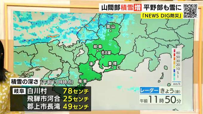 岐阜県白川村では、22日(金)正午までに78センチの雪が積もり、21日よりも積雪が増えています。