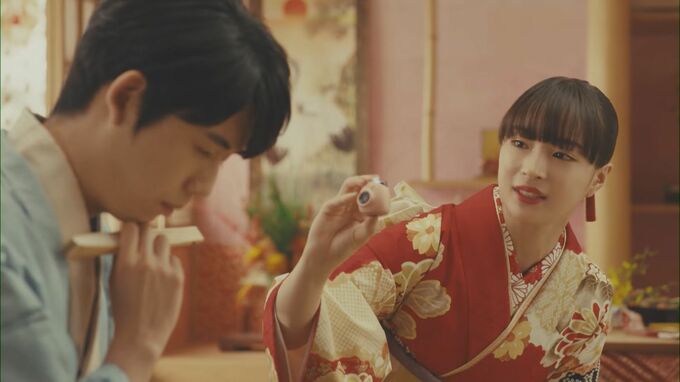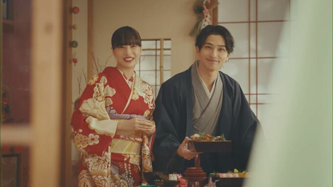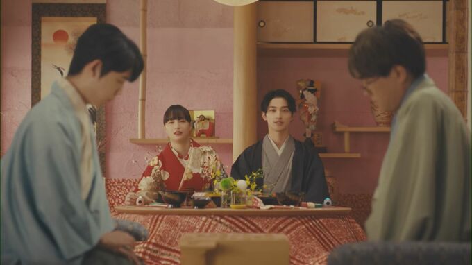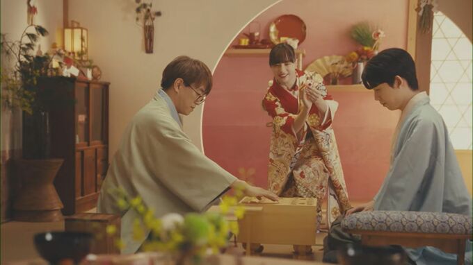 広瀬さんと横浜さんの家へ遊びにきた藤井八冠と羽生九段の2人が、将棋盤を見つけた途端、お節料理などに目もくれず将棋に没頭してしまうという設定で、藤井八冠は至近距離で撮影されてもしっかり演技に集中!