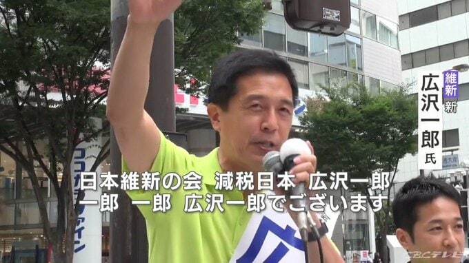 日本維新の会の新人・広沢一郎さん。傍らで、その姿を見守るのは、妻の真理さんです。