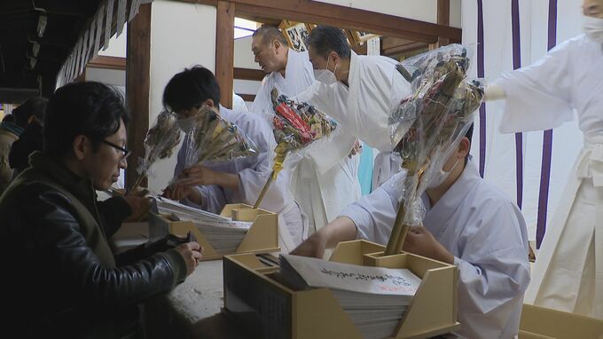 午前0時の開始と同時に境内 の授与所が開き、祈祷されたばかりの「一番札」や福をかき寄せると言われる「福熊手」を求める大勢の人たちで境内は熱気に包まれました。