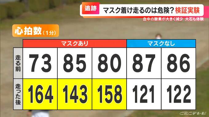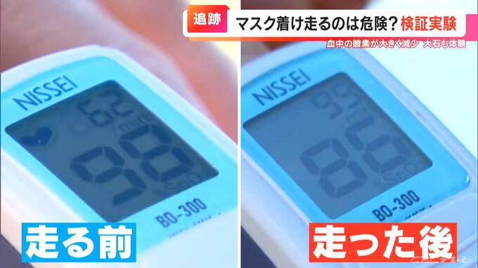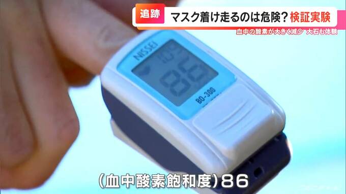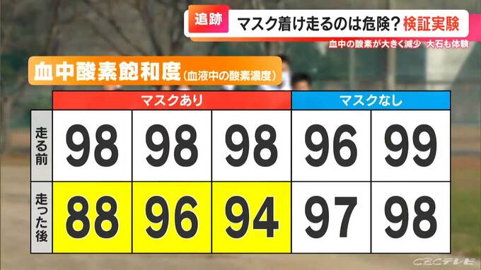 学生5人の数値を見ると、マスクをつけて走った3人の方が血中酸素飽和度の低下がはっきり表れています。