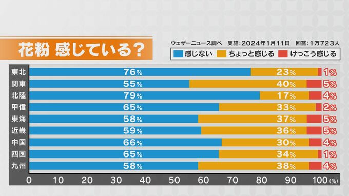 1月に実施された調査でも、関東地方や東海地方などでは約4割の人が「花粉を感じる」と回答しています。