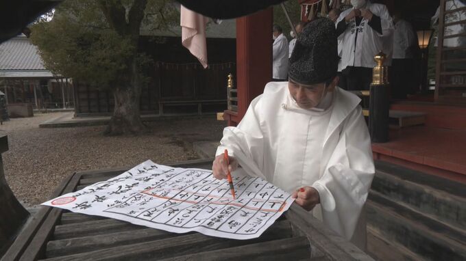 まずは、くじびきで吉凶を占う判定表を作り、その後、射手を務める岡崎市出身の会社員・小野浩紀さんが、約28メートル先の的を狙って2本の矢を放ちました。