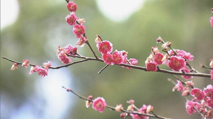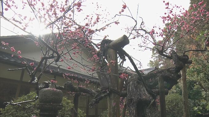 樹齢およそ300年の古木のため倒れないように丸太で支えられていますがことしも健やかに花を咲かせ一足早い春の訪れを告げています。見頃は来週いっぱいということです。