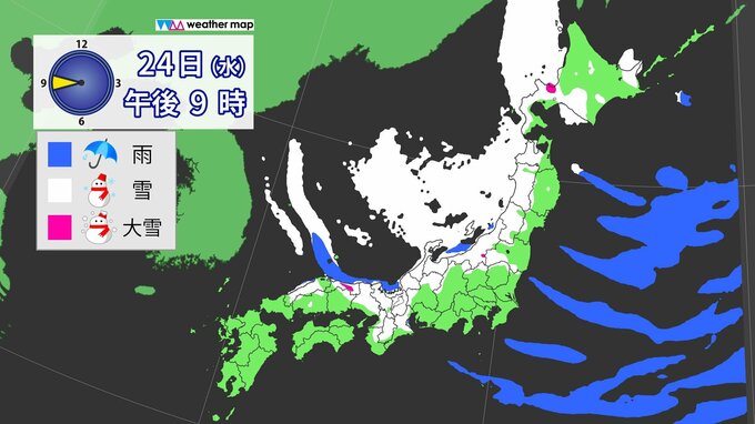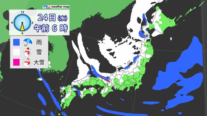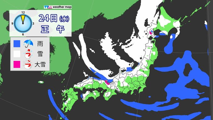 24日(水)は各地で雪や暴風のピークとなります。スーパーコンピューターの予想では、午前中は名古屋など濃尾平野、午後は大阪など大阪平野にも雪雲が流れ込む予想です。