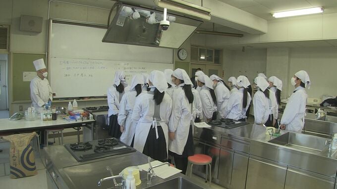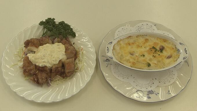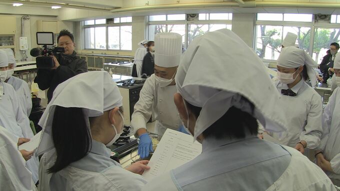 県立吉良高校の2年生17人は、日本酒の製造過程で出る「米粉」を片栗粉や小麦粉の代わりに使ったチキン南蛮やグラタンのレシピを考え、ホテルの料理長に鶏肉の切り方や揚げ方などのアドバイスをもらいながら調理しました。