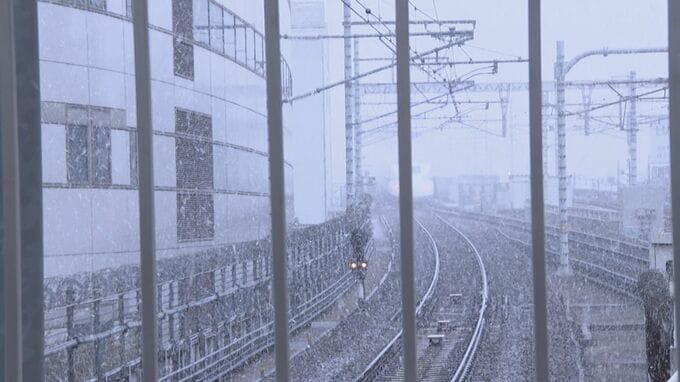 「午前8時、名古屋駅は大粒の雪が降っています。ホームに入ってくる新幹線も雪をかぶっています」