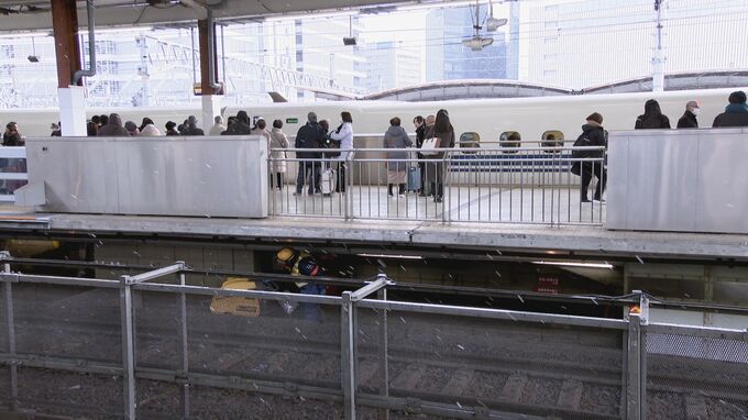 東京方面のホームには雪が多い滋賀県の米原付近を通過した新幹線が、約5分おきに停車します。